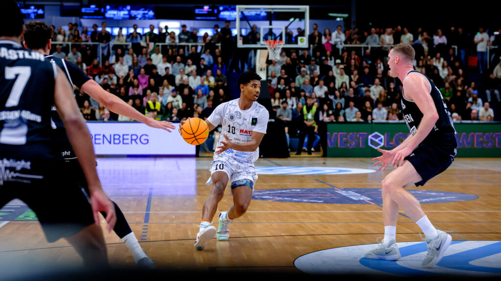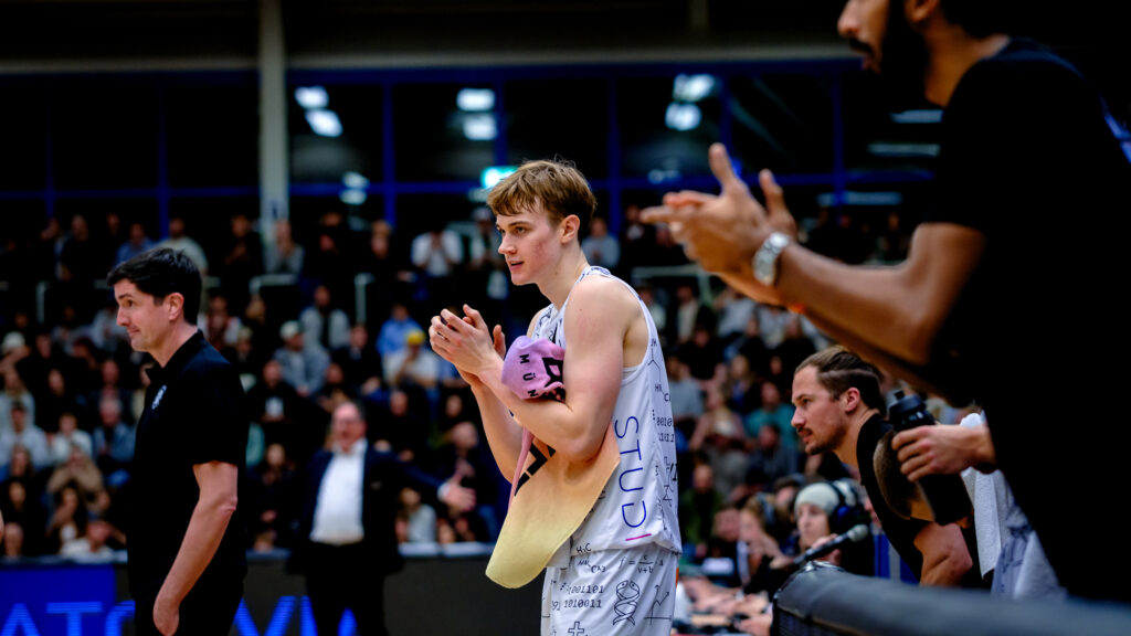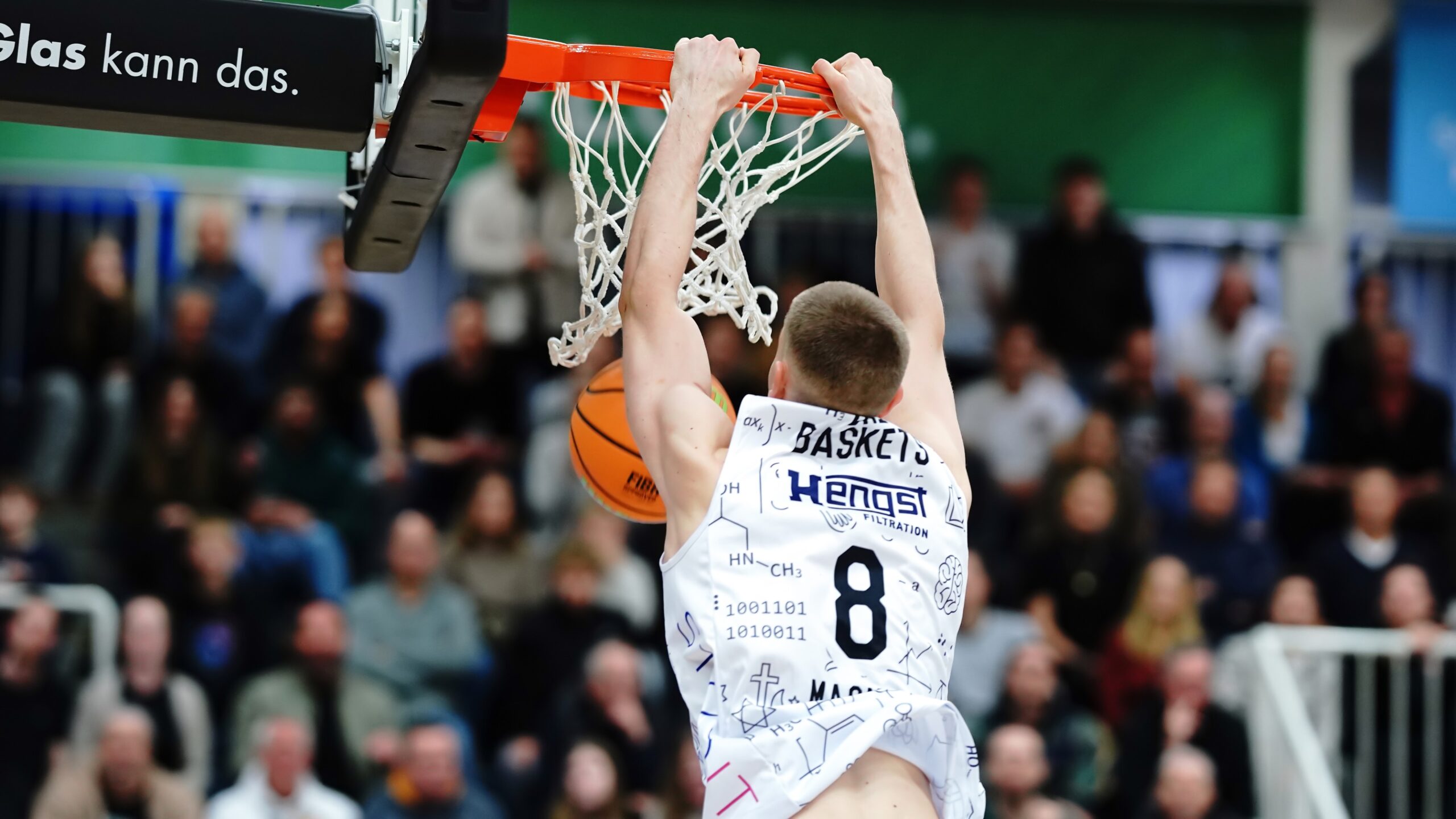 Drohte der von so manch einem erwartete Verlauf und der Favorit marschierte vorne weg? Denkste! Nick McMullens nächste Zähler und sein Monsterblock in der Defensive nur Sekunden später gaben den Energieschub. Die Hütte brannte endgültig, als Baskets-Kapitän Cosmo Grühn erstmals in dieser Saison aufs Parkett kam. Die Begeisterung der Fans trug Münsters junges Team fortan durch die von den Kontrahenten gleichermaßen mit hoher Intensität geprägte Partie. Bo Hodges und der Distanztreffer von Nick McMullen hielten Anschluss (23:29, 14.).