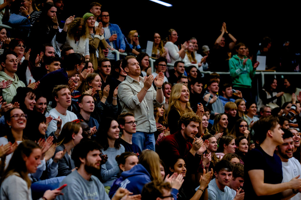 Die Uni Baskets bewiesen große Moral und bekamen den beinahe schon kitschigen Energieboost ihres Publikums, als Cosmo Grühn seinen ersten Saisondreier versenkte (50:51). In bewährter Manier feierten sich der Kapitän und die nun stehenden Baskets-Fans gegenseitig. Das Lachen, das in den vergangenen, nicht einfachen Wochen so fehlte, es war zurück auf dem Court. Die Uni Baskets spielten nun wie befreit auf. Sie kamen über feine Ballbewegung zu freien Distanztreffern von Paul Viefhues und Bo Hodges und zur nächsten Führung (59:56). Die Halle tobte, der „Capitano“ riss seine Mitspieler mit.