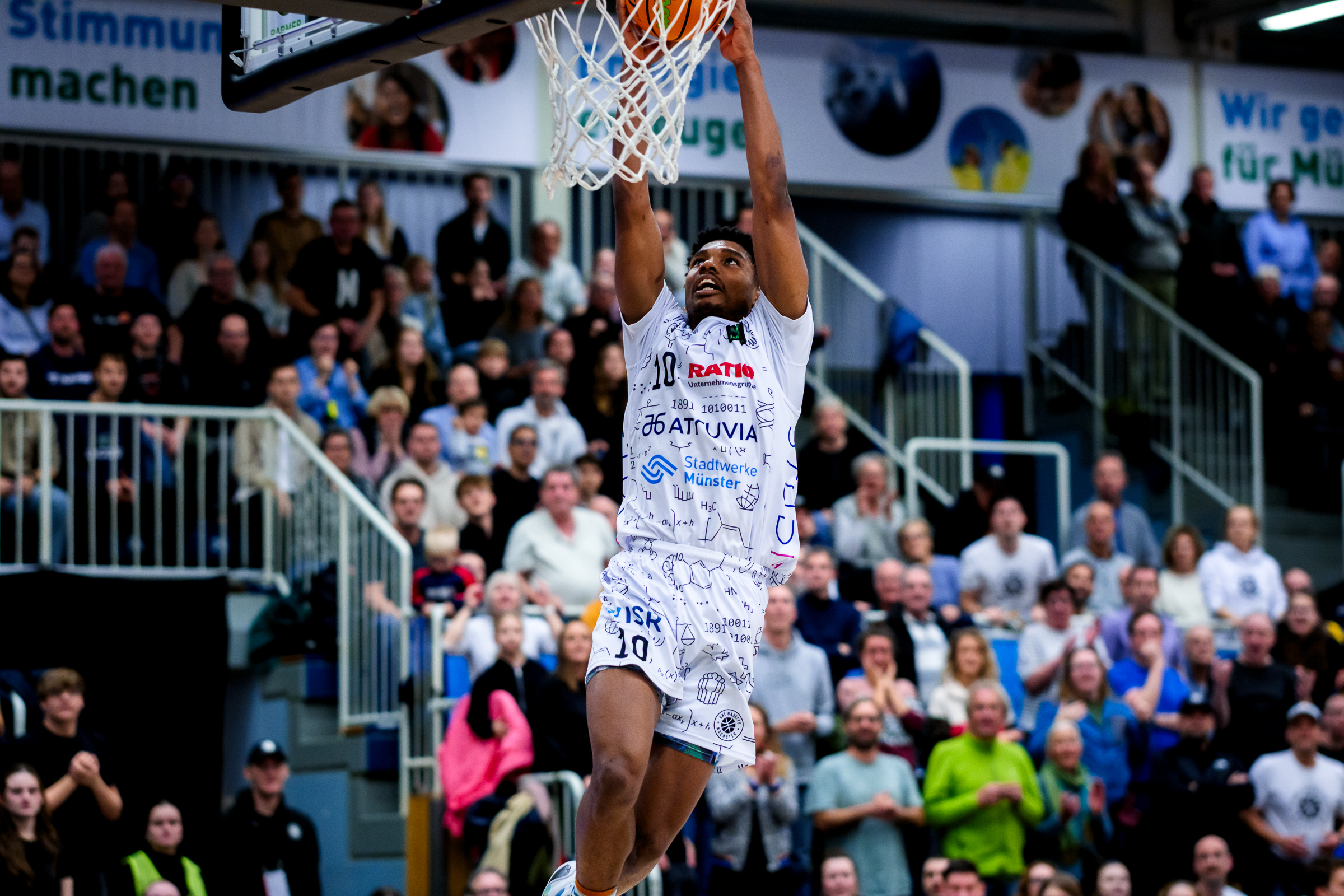 Drohte der von so manch einem erwartete Verlauf und der Favorit marschierte vorne weg? Denkste! Nick McMullens nächste Zähler und sein Monsterblock in der Defensive nur Sekunden später gaben den Energieschub. Die Hütte brannte endgültig, als Baskets-Kapitän Cosmo Grühn erstmals in dieser Saison aufs Parkett kam. Die Begeisterung der Fans trug Münsters junges Team fortan durch die von den Kontrahenten gleichermaßen mit hoher Intensität geprägte Partie. Bo Hodges und der Distanztreffer von Nick McMullen hielten Anschluss (23:29, 14.).