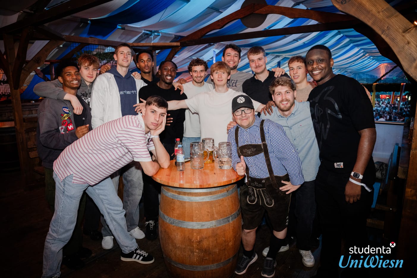 Neben einer Trainingswoche mit ihren täglichen Einheiten haben Mannschaft und Trainerteam der UniWiesn, auf der sie vom Baskets-Partner studenta eingeladen waren, am Dienstagabend einen Besuch abgestattet. „Wir bedanken uns sehr herzlich bei Hugi und seinem studenta-Team für die Einladung“, sagte Helge Stuckenholz, Manager der Uni Baskets. Gemeinsam mit der 1. Damen des UBC Münster „hatten die Jungs Spaß. Einige neue Spieler kannten das Konzept Oktoberfest bisher noch nicht. Von daher war es für sie sehr interessant und lustig. Es war mal was anderes als nur Basketball“, berichtete Cheftrainer Götz Rohdewald über den Kurzbesuch, der frühzeitig zwischen zwei fordernden Trainingseinheiten zu Ende ging.