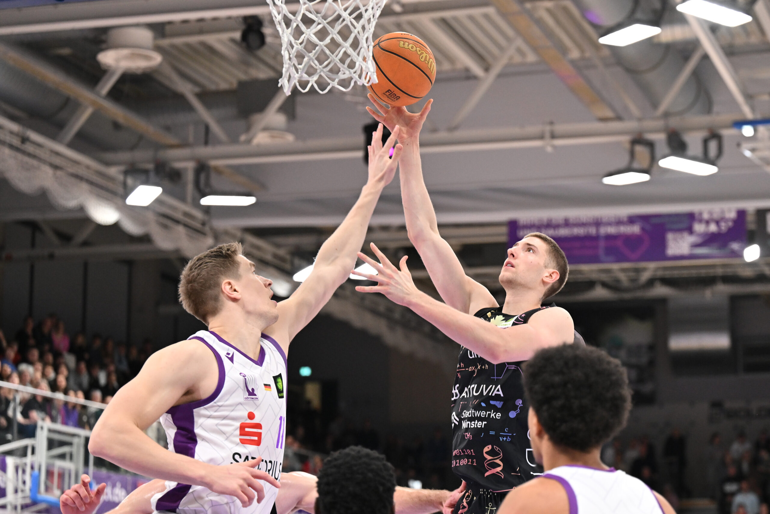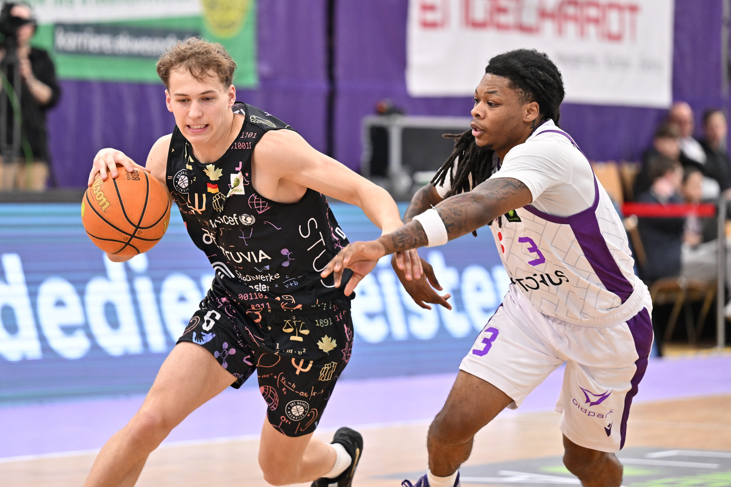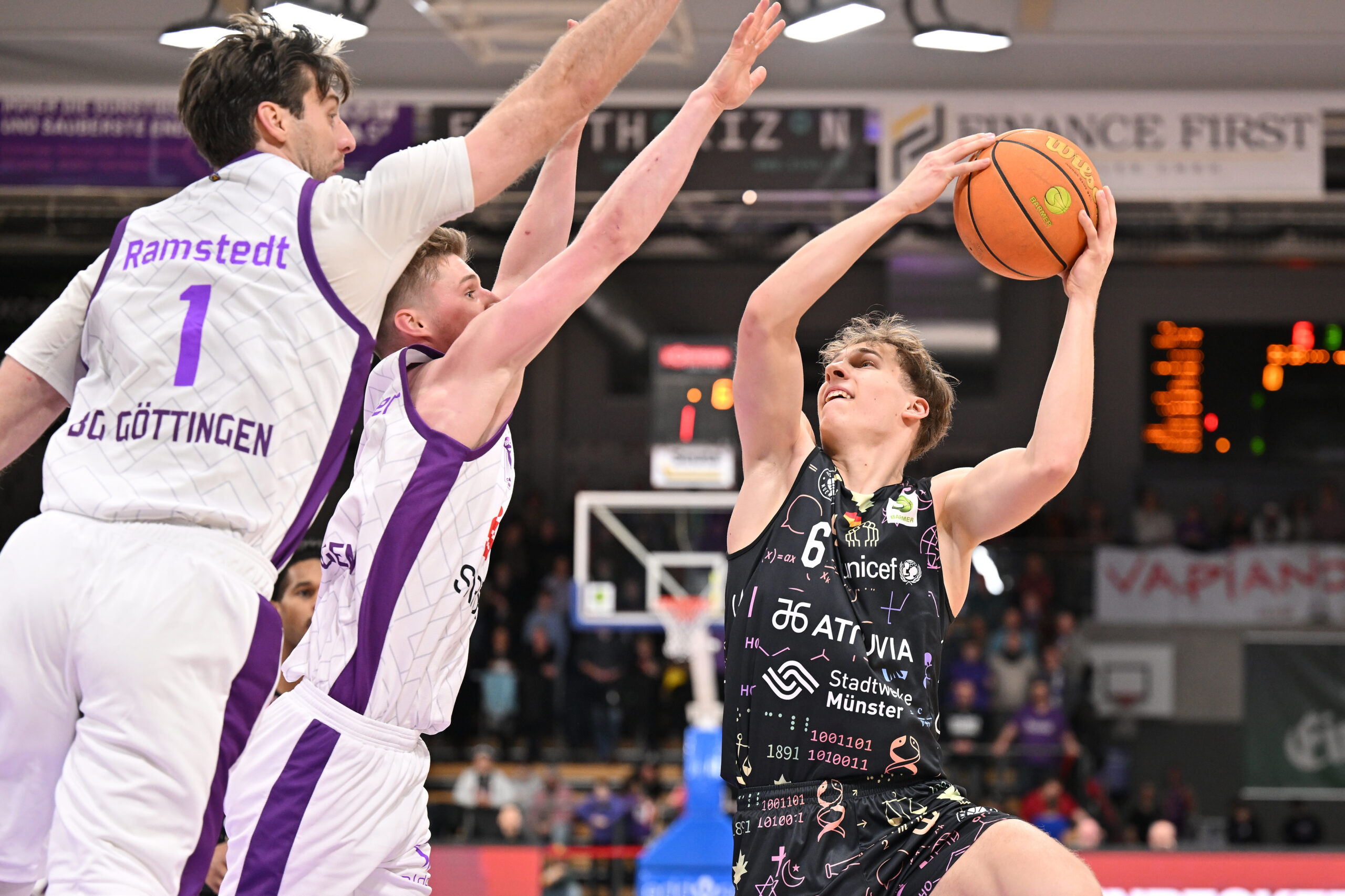 Bei der BG Göttingen mussten die Uni Baskets die gewohnten Ausfälle Adam Touray, Bo Hodges und Julius Ferber verkraften, während ebenfalls dezimierte Gastgeber wieder auf die Rückkehr von Robin Lodders bauen konnten. Die Begegnung begann ausgeglichen. Oli Pahnke eröffnete mit fein erspieltem Distanztreffer. 11:10 lagen die Gäste Mitte des Auftaktviertels nach fokussiertem Vortrag und Jason Anis Dreier vorne, ehe sein eher unglückliches als gewolltes unsportliches Foul starke drei Minuten der Göttinger einleitete. Spielstark und defensiv aggressiv erarbeiteten sich die Veilchen über einen 13:0-Lauf eine erste zweistellige Führung (23:11, 8.). Dann konterten die Münsteraner über stilbildende Defensive und einen Handkontakt-Dreier Cosmo Grühns sowie Freiwürfe von Neil Masnic. Münsteraner Ballverluste erst zum Ende des Viertels verhinderten ein noch besseres Ergebnis nach Abschnitt eins (24:16).