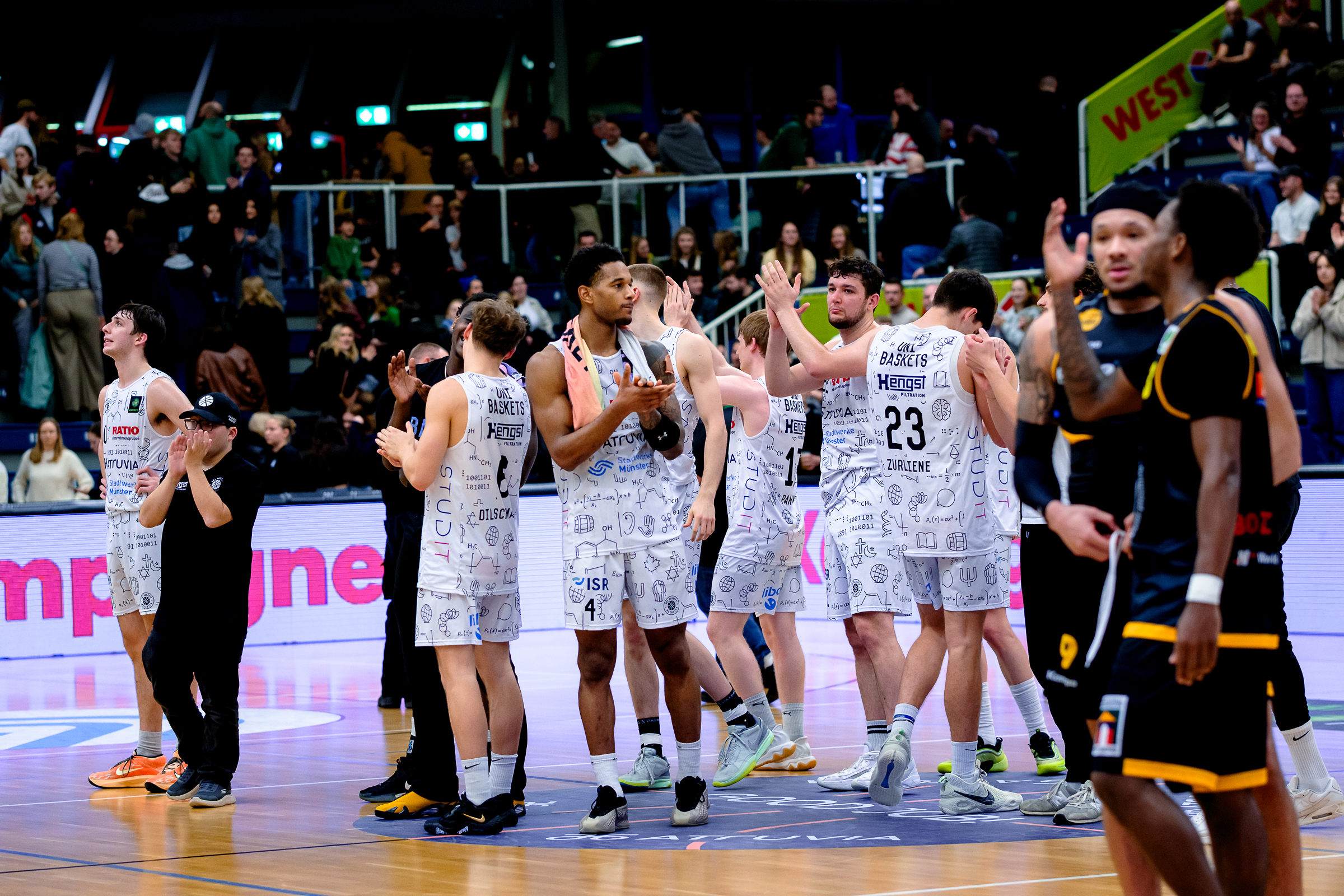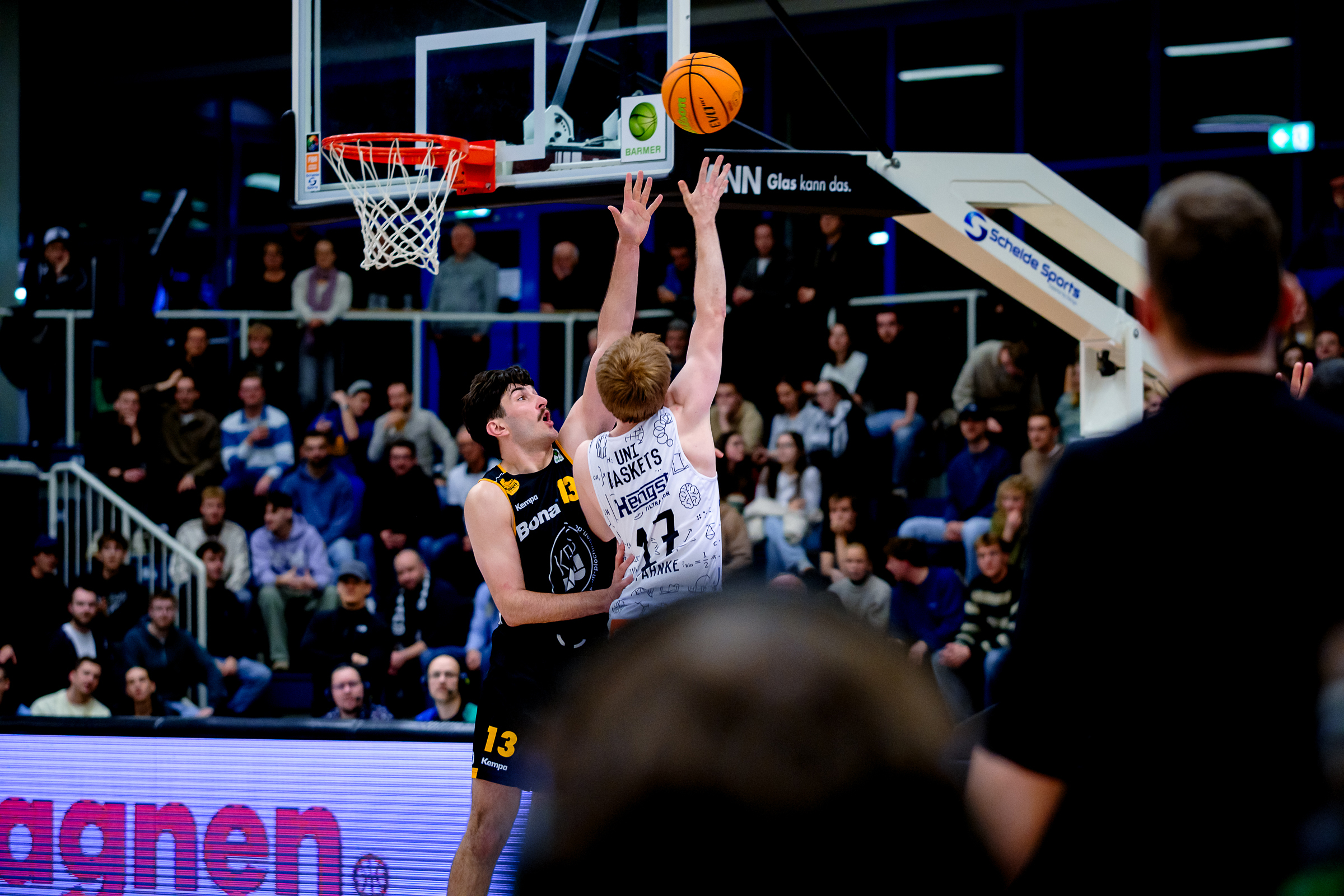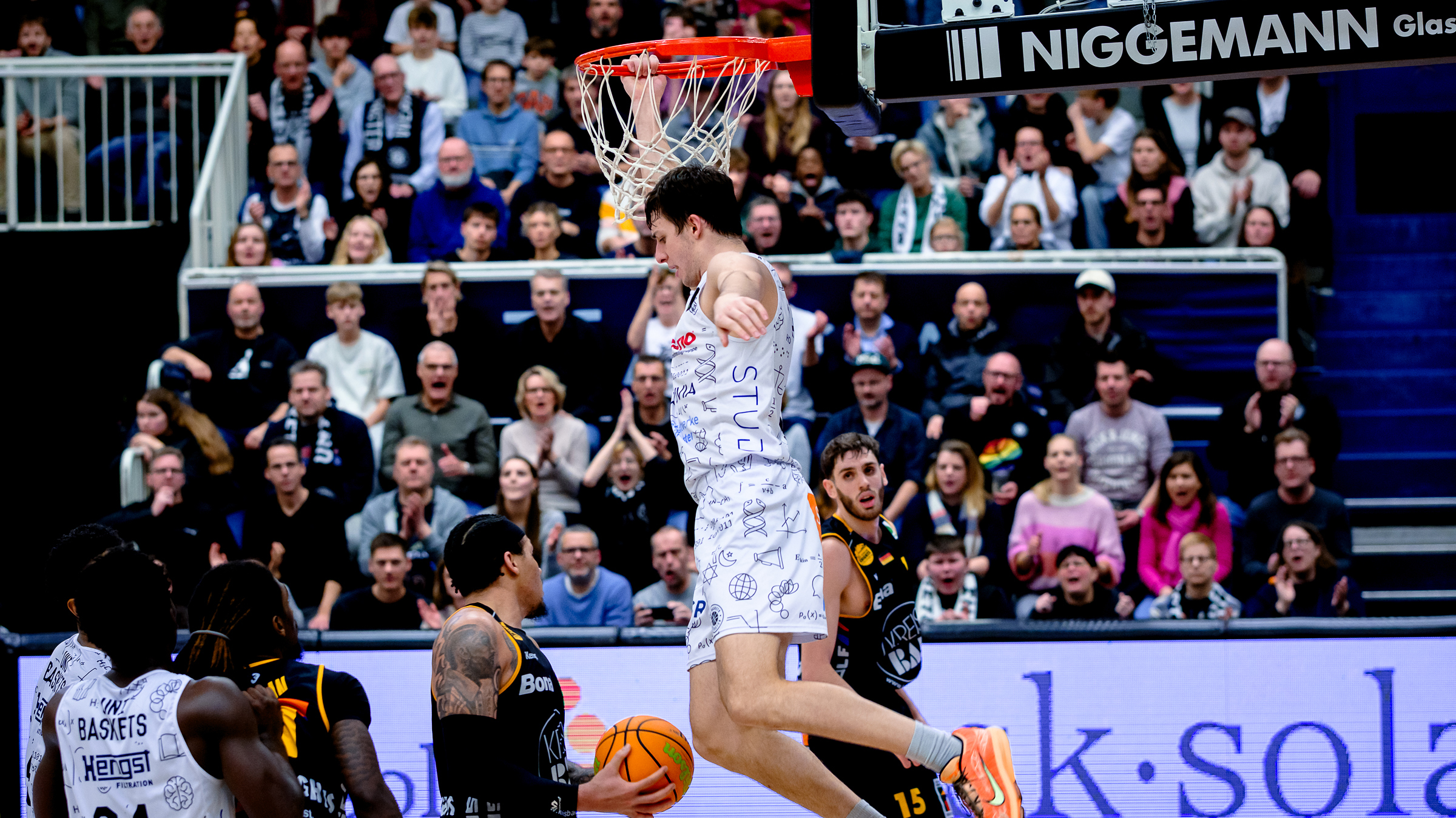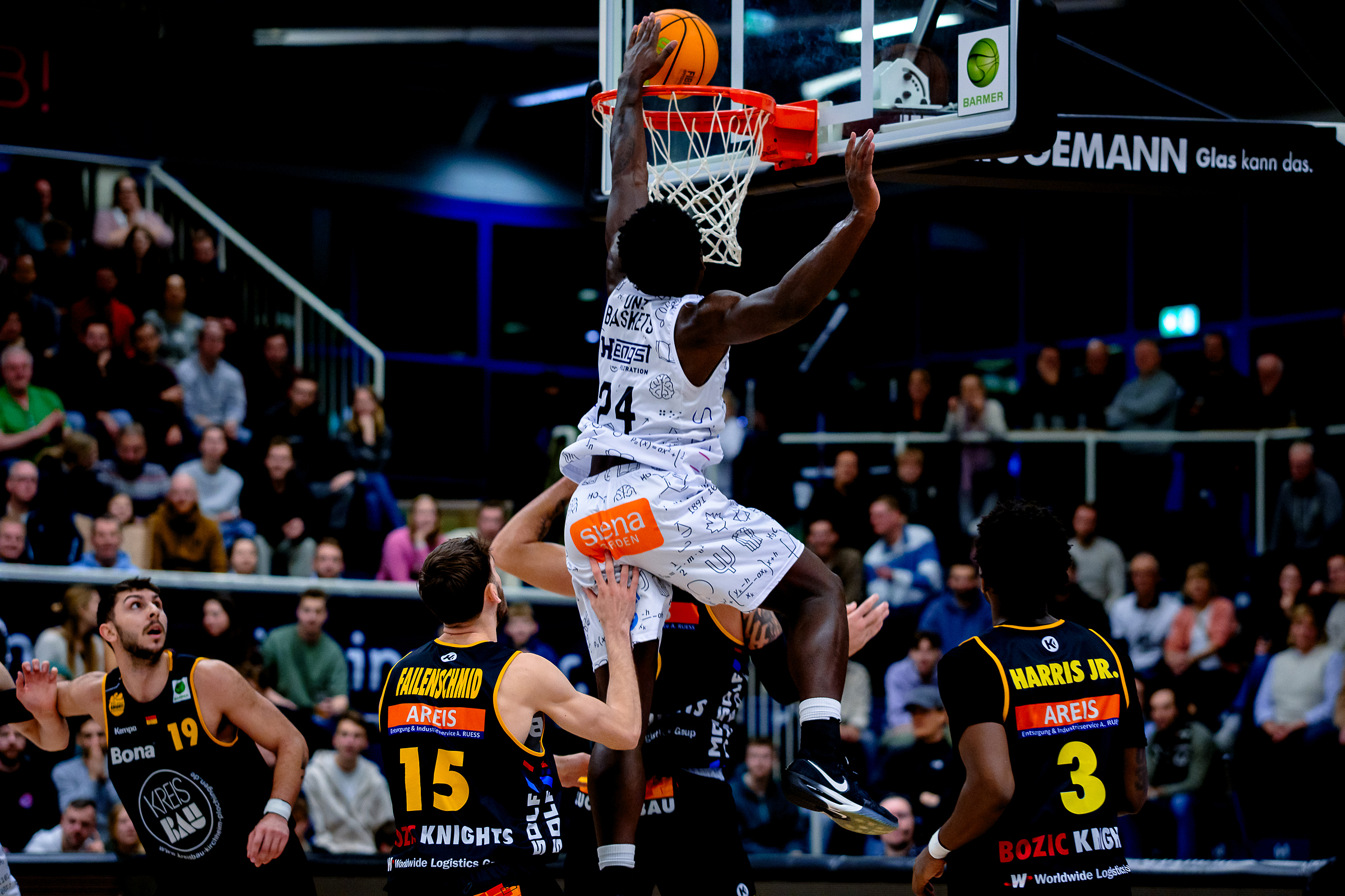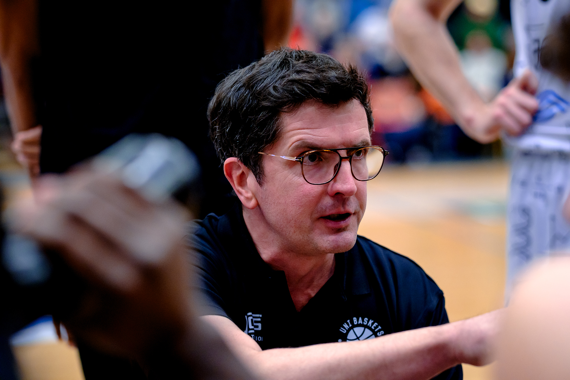 Götz Rohdewald, Cheftrainer der Uni Baskets:„Wir spielen schon ohne Bo, dann auch noch ohne Julian. Dann müssen Thore und Andrew den Spielaufbau machen. Sie haben alles gegeben und gekämpft. Aber dann ist es schwierig bis unmöglich. Der Rest des Spiels ist einfach erklärt: Wir haben gekämpft und alles getan. Wir kriegen wieder zwei Freiwürfe in der ersten Halbzeit. Am Ende haben wir sieben in der zweiten gekriegt. Ich bin sehr dankbar dafür, aber das Problem ist einfach, ich weiß nicht, was wir da machen sollen. Es ist nicht das ganze Spiel, aber es ist wichtig in einem Basketballspiel, dass man an die Freiwurflinie kommt. Russell hat drei Dreier hintereinander getroffen, die sehr wehgetan haben. Mit der heutigen Line-up ohne Bo, Julian und Adam ist es einfach schwierig.“