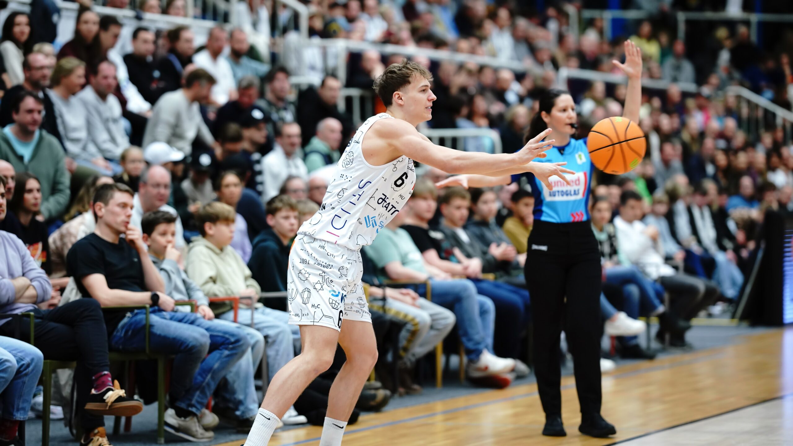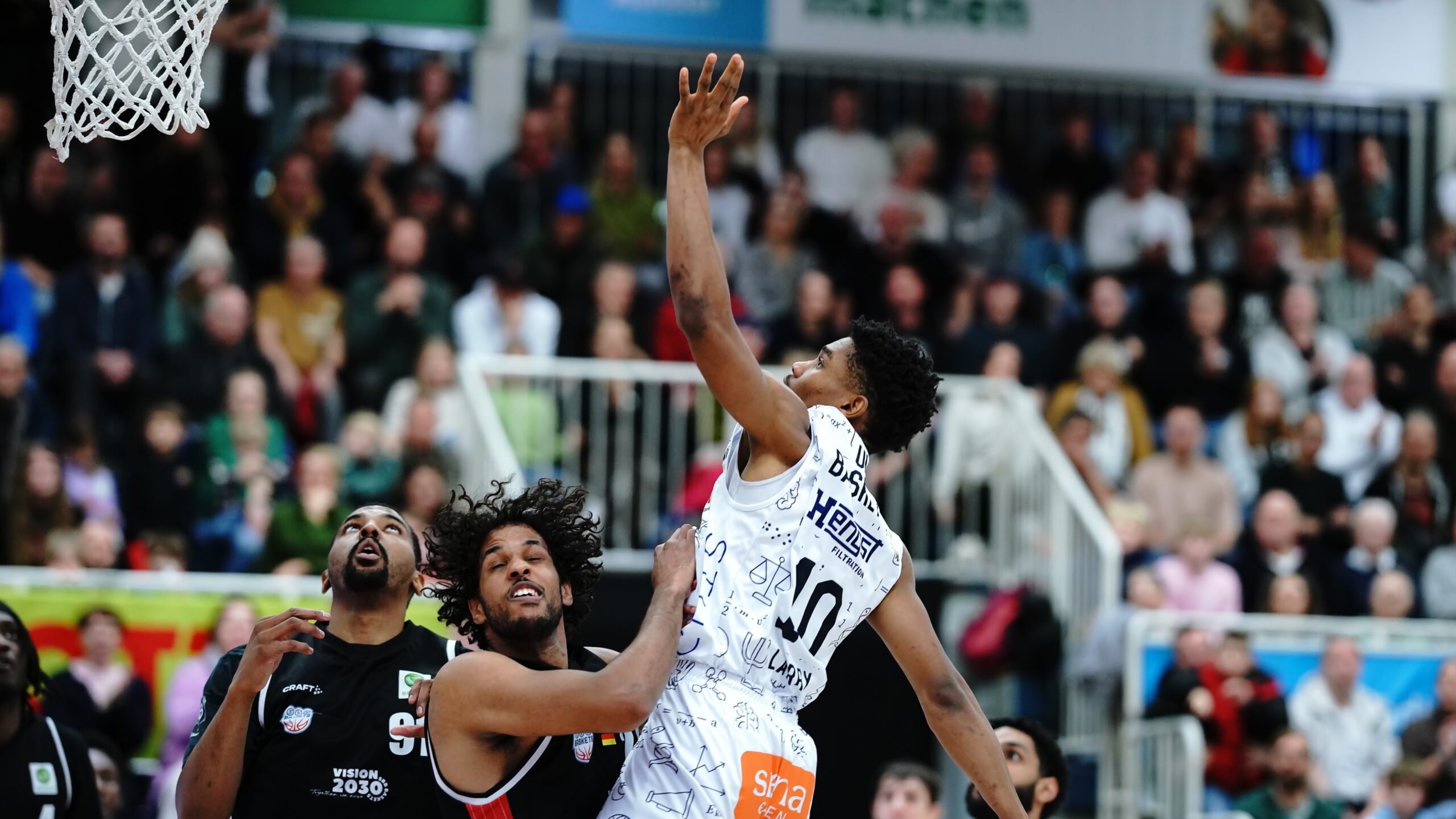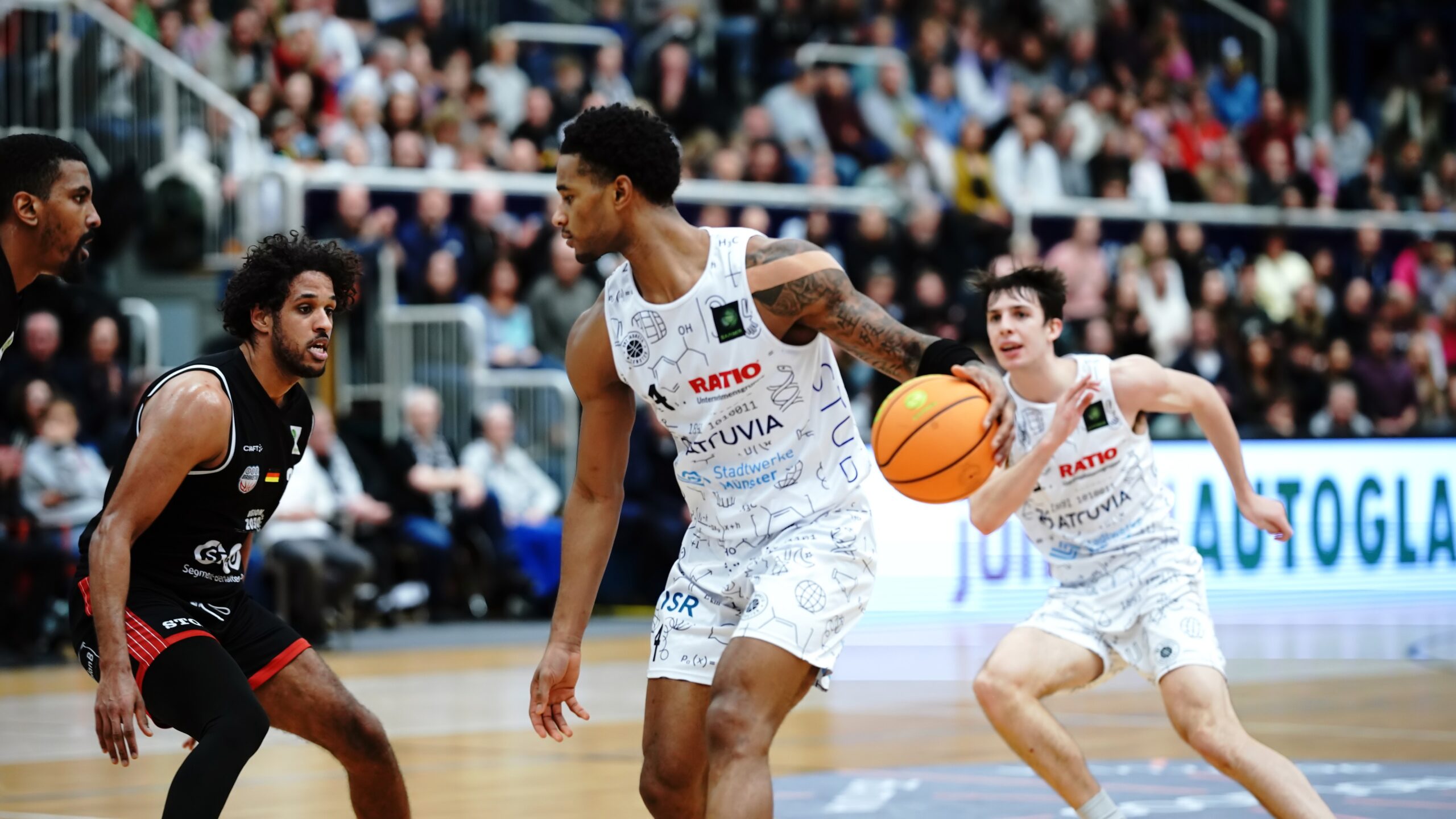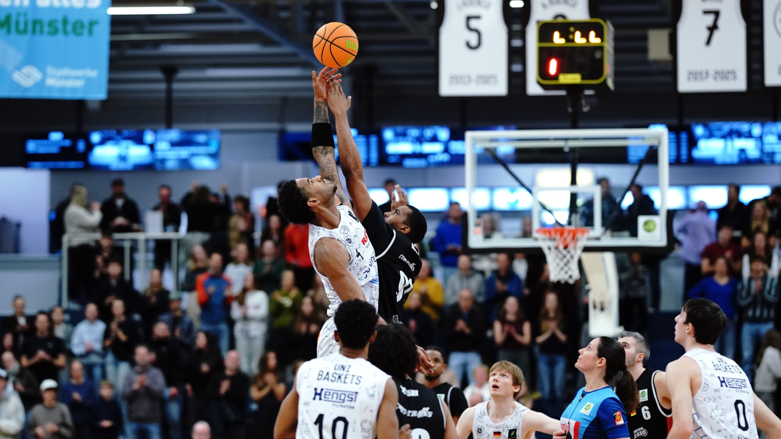 Unter den Augen der Hall-of-Famer Jan König und Stefan Weß und vieler weiterer Aufstiegshelden in die ProB sowie Handball-Weltmeister Florian Kehrmann kamen die Uni Baskets bockstark aus der Halbzeitpause. Viertelübergreifend vollendeten Oli Pahnke und Andrew O’Brien den Dreierhagel zum 12:0-Lauf (39:41, 22.). Bevor es erkennbar auch zu einer mentalen Aufgabe hätte werden können, nach so manch einer unglücklichen Niederlage, waren die Münsteraner zurück im Geschehen und ab sofort ungemein resilient. Ein großer Faktor: die Heimkulisse. Wie eine Eins standen die Baskets-Fans hinter ihrer Mannschaft und trieben sie zum Führungswechsel an. Nicht von ungefähr besorgte Thore Dilschmann diesen dann per Korbleger. Neil Masnic bestätigte mit dem 11. Münsteraner Distanztreffer zum 51:49 (28.) Unverändert der Vorsprung vor dem Schlussviertel: 55:53.