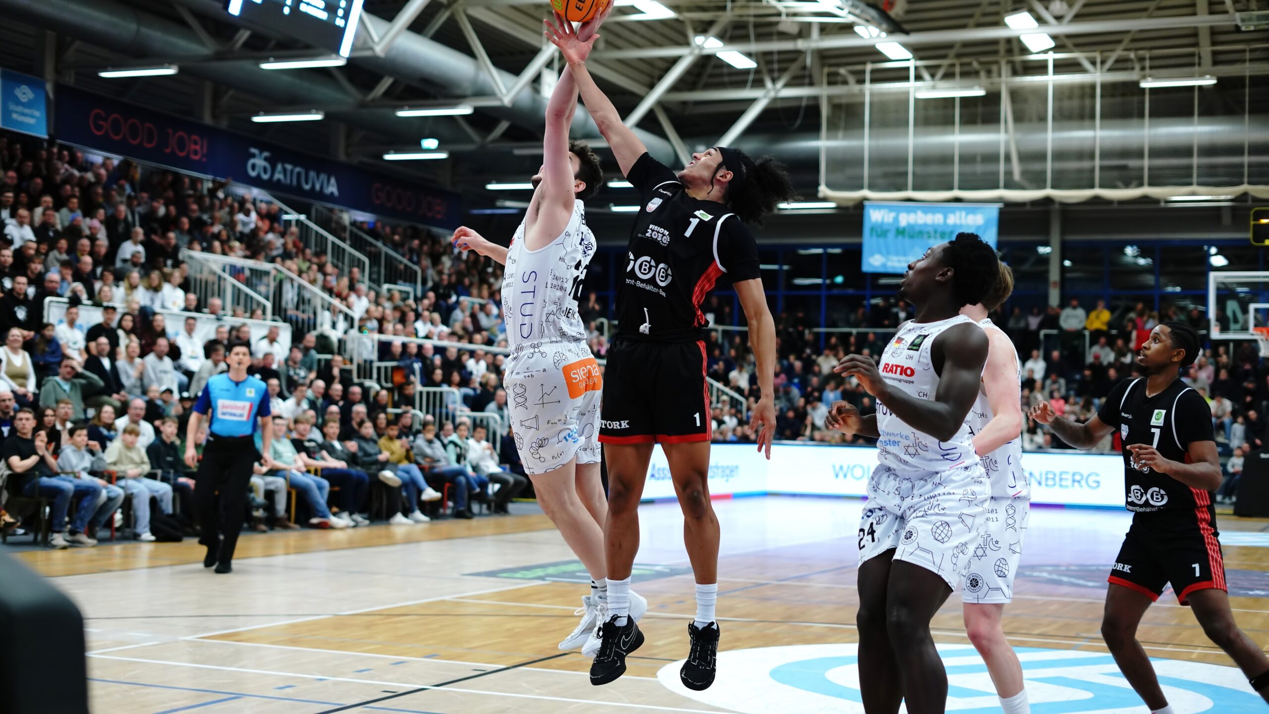 Die SBB Baskets intensivierten jedoch die Defensive massiv und beendeten das Viertel über das Plus am offensiven Brett mit einem 11:0-Run beinahe zur 14-Punkte-Halbzeitführung (27:41). Die Münsteraner Offensivprobleme im zweiten Viertel stoppte der erst 19-jährige Thore Dilschmann mit zwei famosen und abgeklärt kreierten Distanztreffern gerade rechtzeitig in den Schlusssekunden der ersten Halbzeit. Viel Rückenwind und Applaus für die Mannen von Coach Götz Rohdwald beim Gang in die Kabine mit einem 8-Punkte-Rückstand (33:41). Ein Stimmungsbooster!