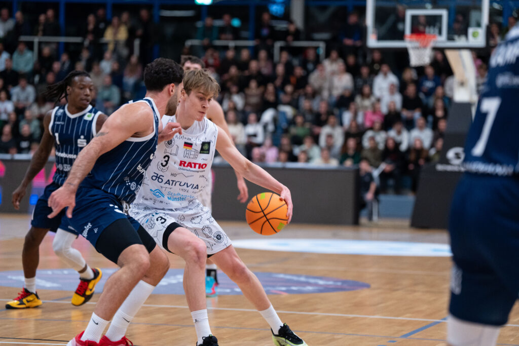 Mit verändertem Line-up – Neuzugang Zurliene debütierte im zweiten Viertel, weiterhin aber ohne Drei (Grühn, Ferber und Touray) – erwischte der Gastgeber nach feinem Anspiel Julan Larrys auf Nick McMullen einen 10:4-Start (4.). Flinke Münsteraner Hände ermöglichten Ballgewinne und die höchste Führung des Auftaktviertels (16:9, 6.), ehe offene Dreier nicht fielen, sich Ballverluste einschlichen und der Einfluss in der Zone schwand. Die Gäste erhöhten nun deutlich die Physis, kamen immer wieder ans Brett und so zum Führungswechsel (23:24). Neil Masnic, bereits der sechste Münsteraner Scorer, konterte noch vor der Viertelpause des für die Fans attraktiven High-Scoring-Auftakts (25:24).