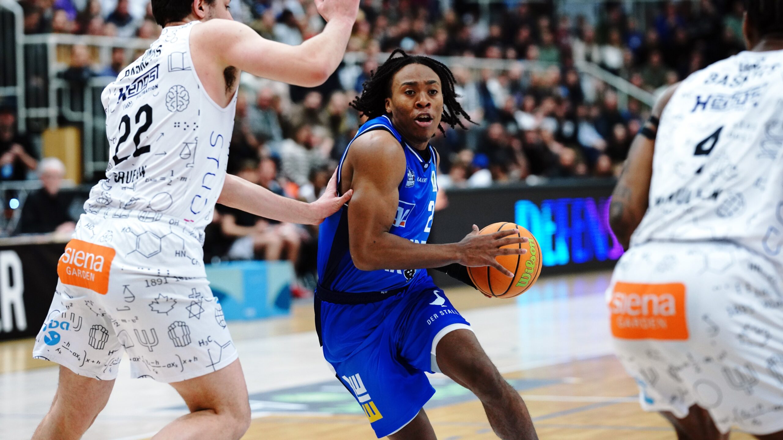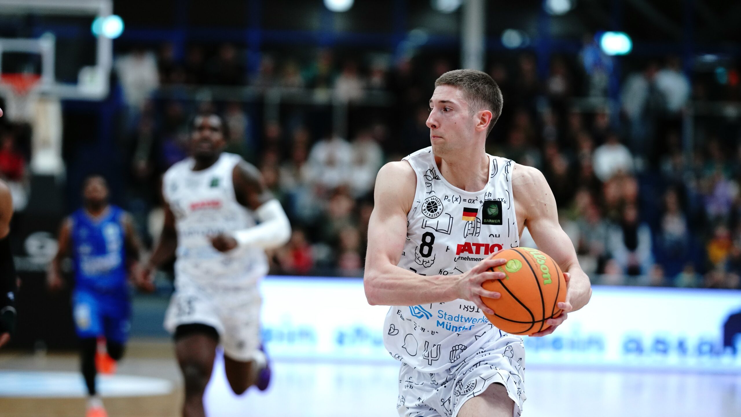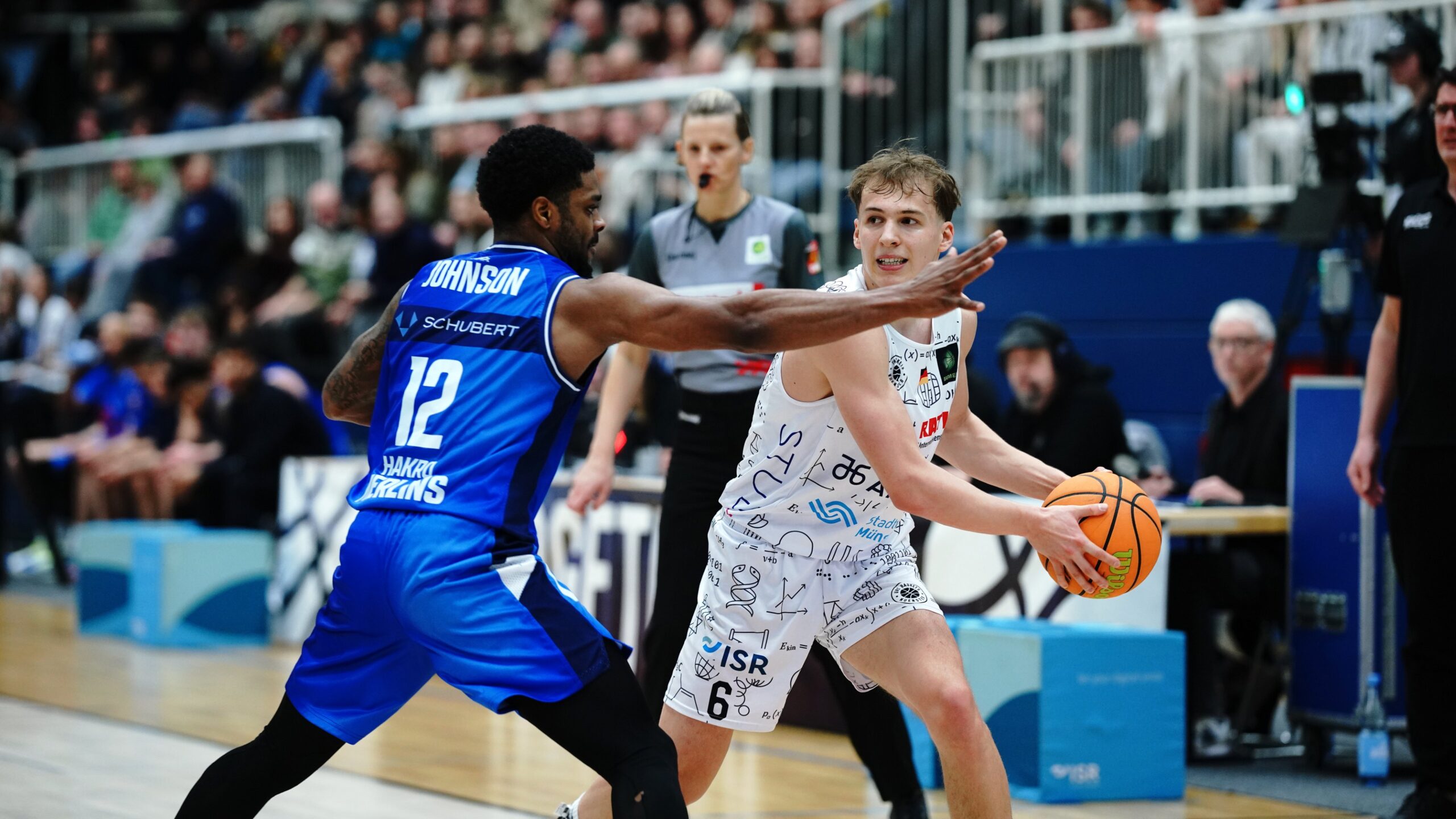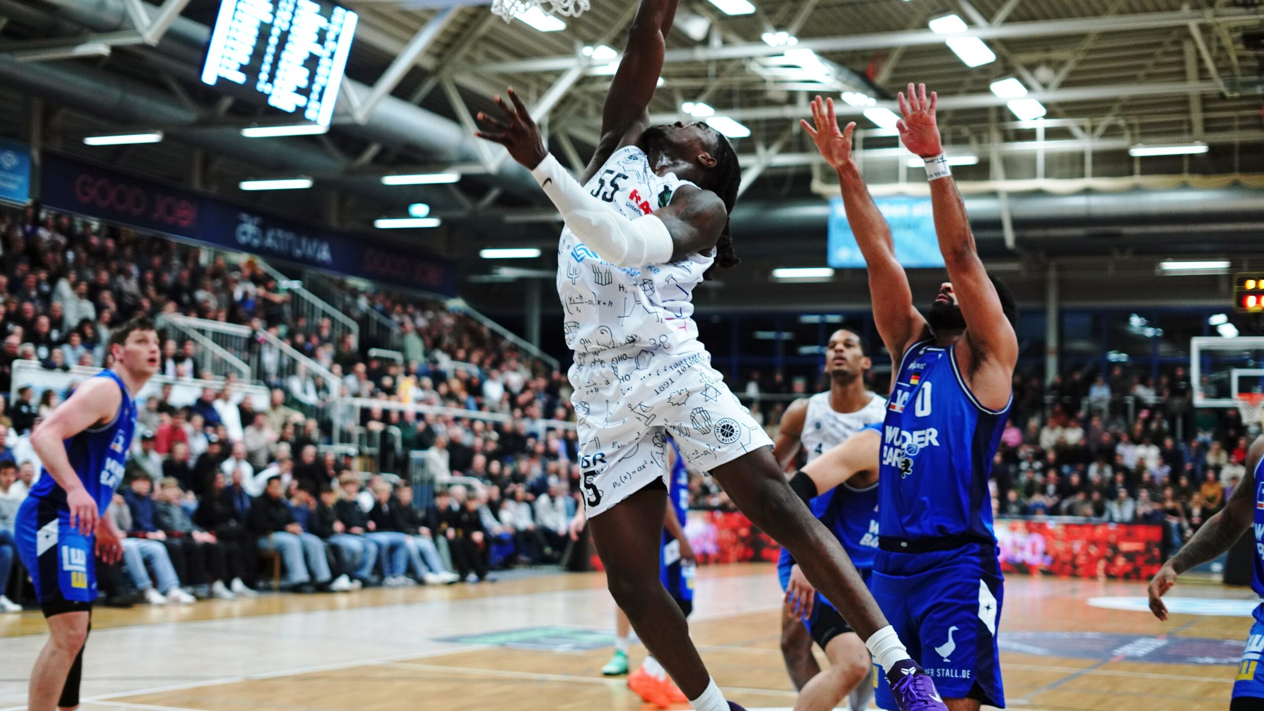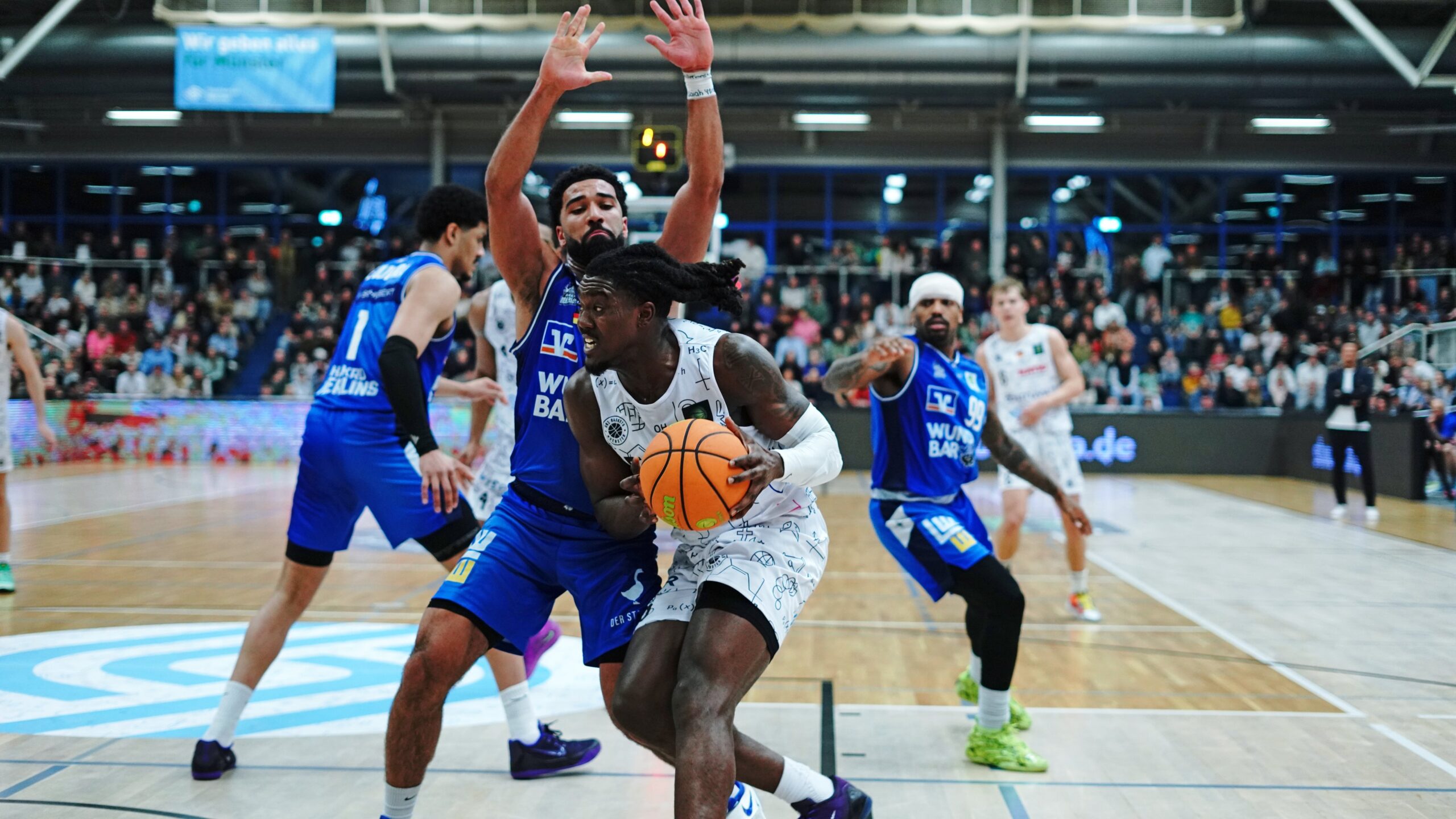 Der ganz weite Stepback-Dreier von Pahnke eröffnete die zweite Hälfte zum 39:48. In den Folgeminuten neutralisierten sich beide Teams im Ergebnis um den 10-Punkte-Rückstand aus Sicht des Gastgebers, der dann den Ball gut bewegte und über Grühn und McMullen in der Zone auf 50:55 aufschloss. Hochintensiv verteidigende Merlins provozierten unbeeindruckt von der aufkommenden Heimkulisse weiter Ballverluste, sammelten bis zum Ende des dritten Viertels schon neun Steals ein und trafen elf Dreier bei einer Dreier-Quote von 46 Prozent bis hierhin. Dieser Physis war das neu sortierte Münsteraner Team jetzt nicht mehr gewachsen und lag mit 50:69 vor dem Schlussviertel vorentscheidend im Rückstand.
