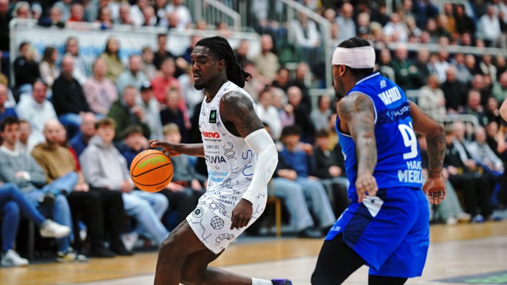Der ganz weite Stepback-Dreier von Pahnke eröffnete die zweite Hälfte zum 39:48. In den Folgeminuten neutralisierten sich beide Teams im Ergebnis um den 10-Punkte-Rückstand aus Sicht des Gastgebers, der dann den Ball gut bewegte und über Grühn und McMullen in der Zone auf 50:55 aufschloss. Hochintensiv verteidigende Merlins provozierten unbeeindruckt von der aufkommenden Heimkulisse weiter Ballverluste, sammelten bis zum Ende des dritten Viertels schon neun Steals ein und trafen elf Dreier bei einer Dreier-Quote von 46 Prozent bis hierhin. Dieser Physis war das neu sortierte Münsteraner Team jetzt nicht mehr gewachsen und lag mit 50:69 vor dem Schlussviertel vorentscheidend im Rückstand.