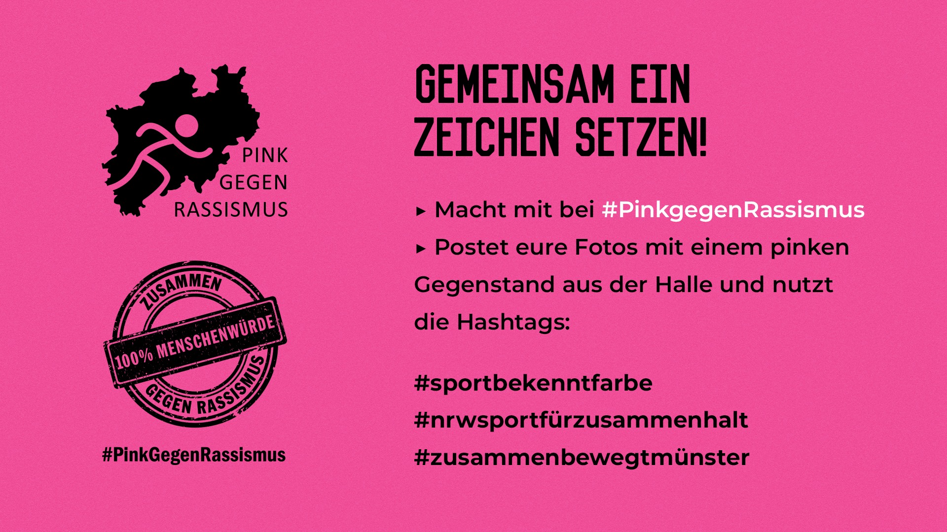 Im Zentrum stehen dabei die Heimspiele der Uni Baskets gegen die BG Göttingen (Sonntag, 18.00 Uhr, Tickets) und PS Karlsruhe Lions (28. März, 19.30 Uhr, Tickets), die Unterstützung der „PINK gegen Rassismus“-Kampagne des Stadtsportbunds Münster sowie die Beteiligung an einer landesweiten Social-Media-Kampagne. Pinke Armbänder sind wie schon im vergangenen Jahr nur ein sichtbares Zeichen des münsterschen Sports im Rahmen der Internationalen Wochen gegen Rassismus 2026 für Vielfalt und Miteinander. Wie ihr daneben die „weiße Wand“ pink einfärben möchtet, ist euch überlassen!